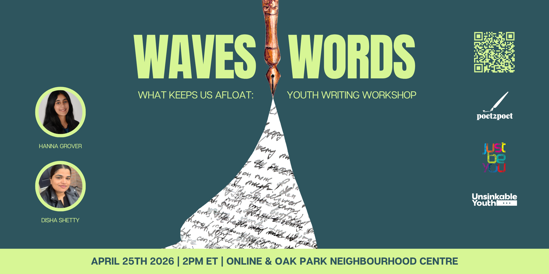 Hosted by Unsinkable with Poet2Poet and Just Be You, this hybrid space is for youth (16–30) to come together, get creative, and talk about real life.